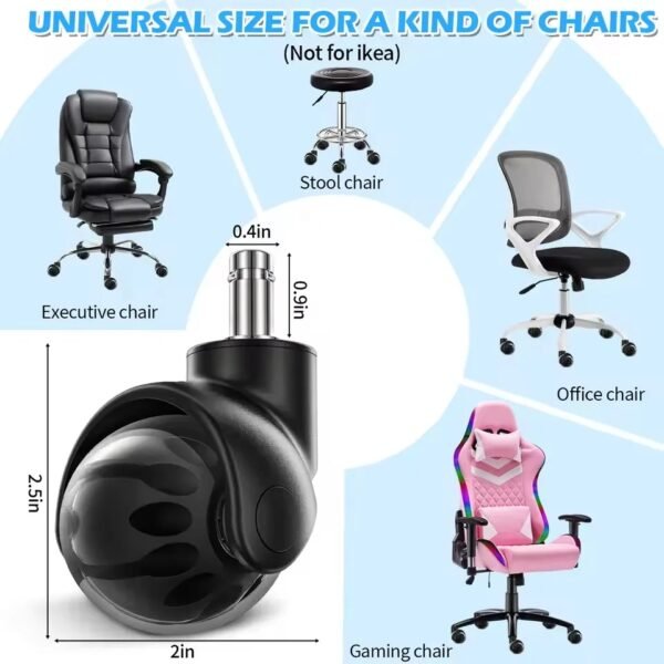 Improve your office chair’s performance with this set of 5 durable 2-inch casters. The ball-style swivel design allows for effortless 360° rotation, while the nylon core and PU tread minimize floor scratches and noise. Fitted with an M11 screw insert, they’re ideal replacements for worn-out wheels on office chairs, stools, and furniture. Whether on wood, carpet, or tile, these wheels offer stability, safety, and silent operation.