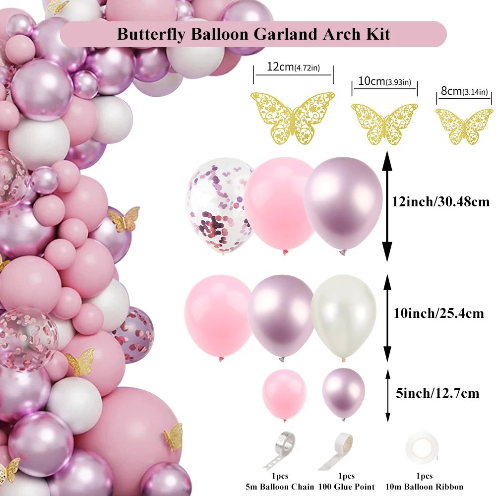 Create a magical party backdrop with this butterfly balloon arch set in soft white, pink, and metallic colors. Featuring confetti balloons and elegant butterfly details, this kit is perfect for girl birthday balloons, baby shower party supplies, and even as a wedding balloons arch. The durable metal balloons kit ensures long-lasting decoration, ideal for indoor or outdoor use. Make your butterfly theme party unforgettable with this easy-to-assemble balloon arch decoration that brings elegance and charm to any celebration.
