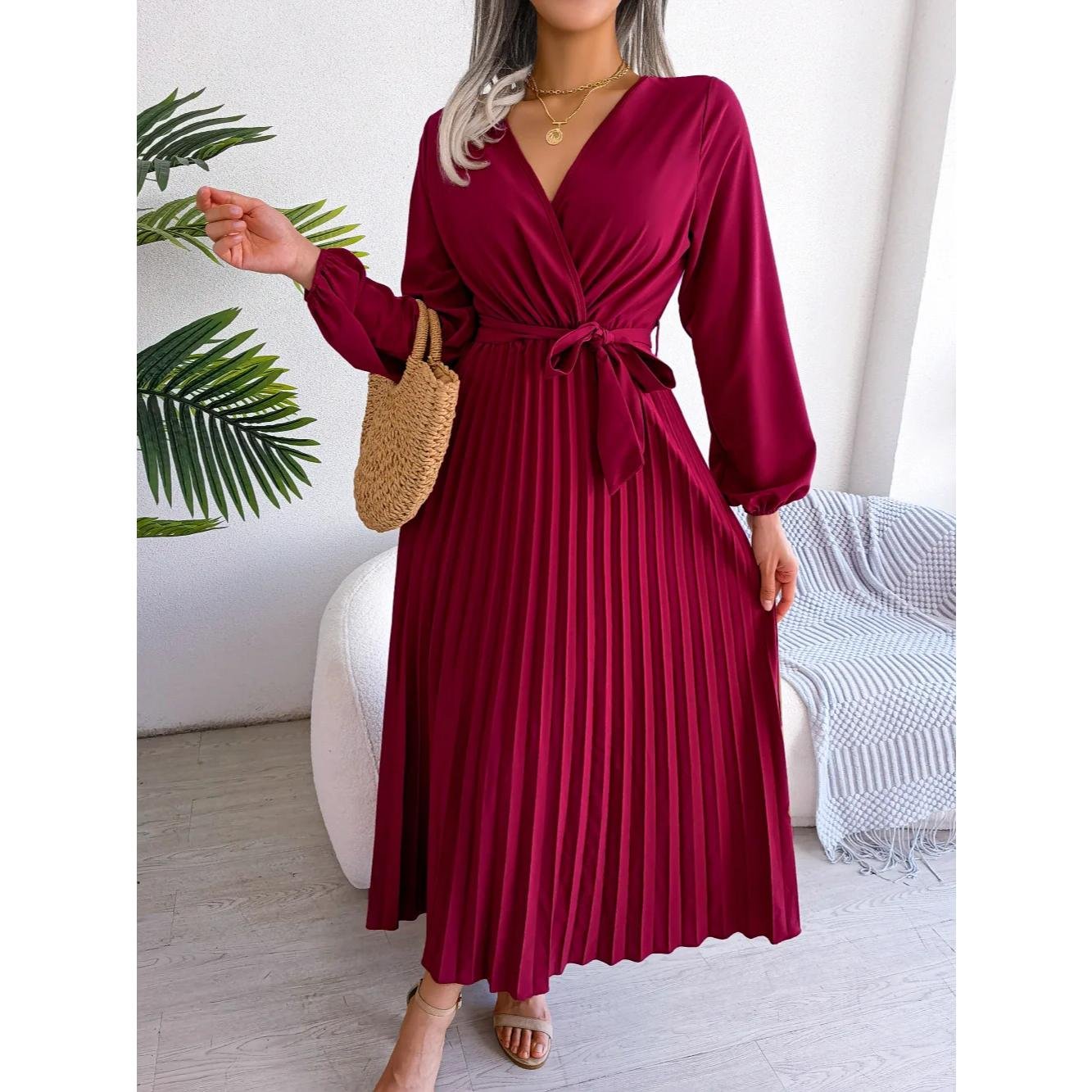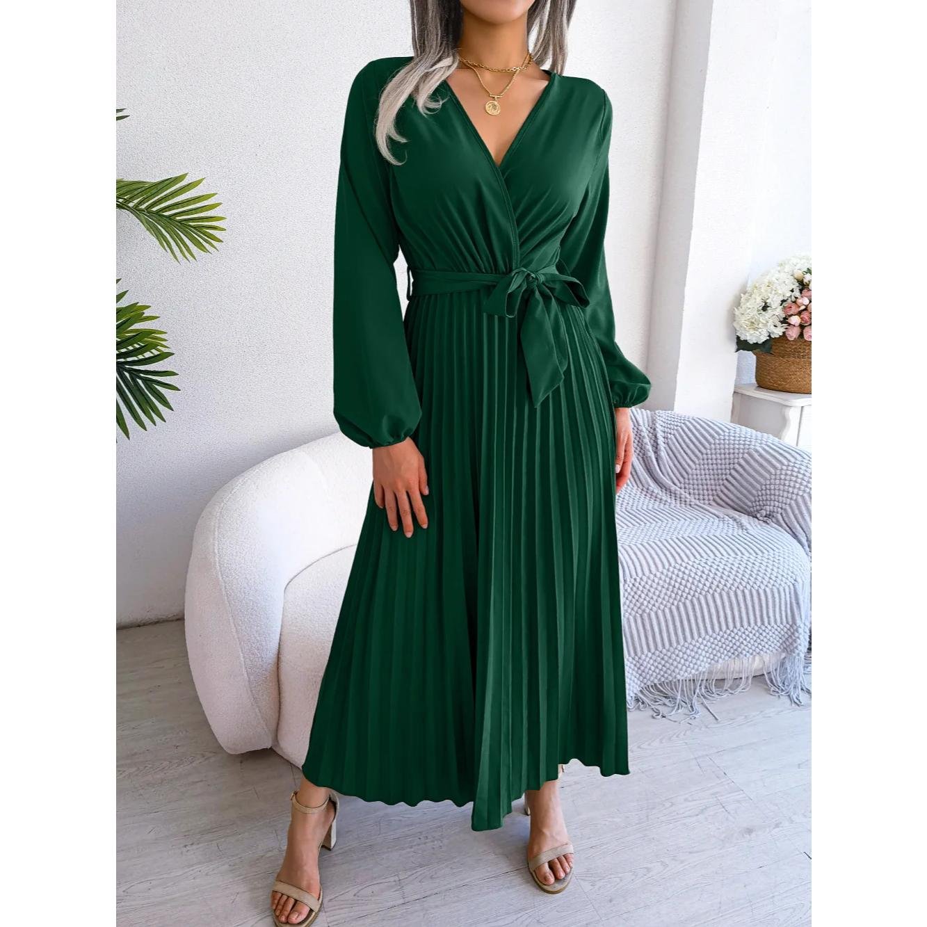 Step into glamour with our V Neck Long Sleeve Maxi Dress. Featuring a stunning V neckline, elegant long sleeves, and a pleated skirt, this dress is perfect for making a lasting impression at any event. The flowing silhouette adds a touch of romance, making it ideal for proms, black-tie events, or special nights out. Crafted from high-quality materials, this dress ensures a comfortable and flattering fit.
