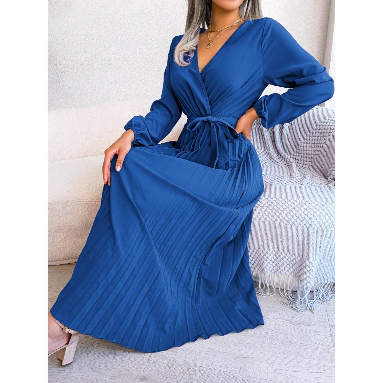 Glamorous V Neck Long Sleeve Maxi Dress Pleated Skirt Evening Wear