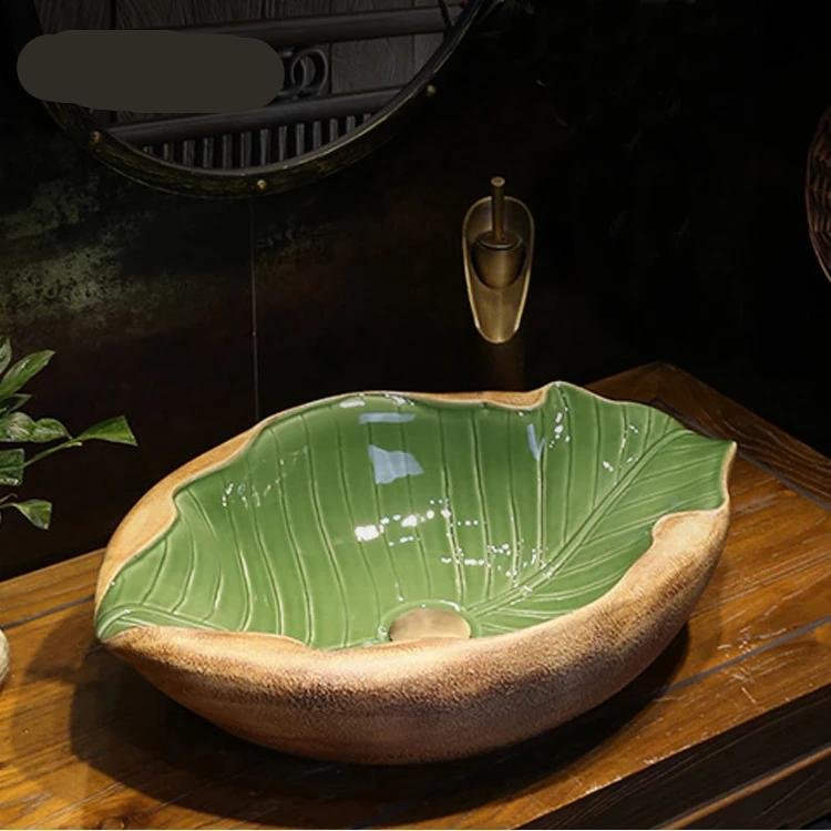 JIENI Luxury Leaf Art Porcelain Sink Set Ceramic Countertop Basin with Antique Brass Waterfall Faucet