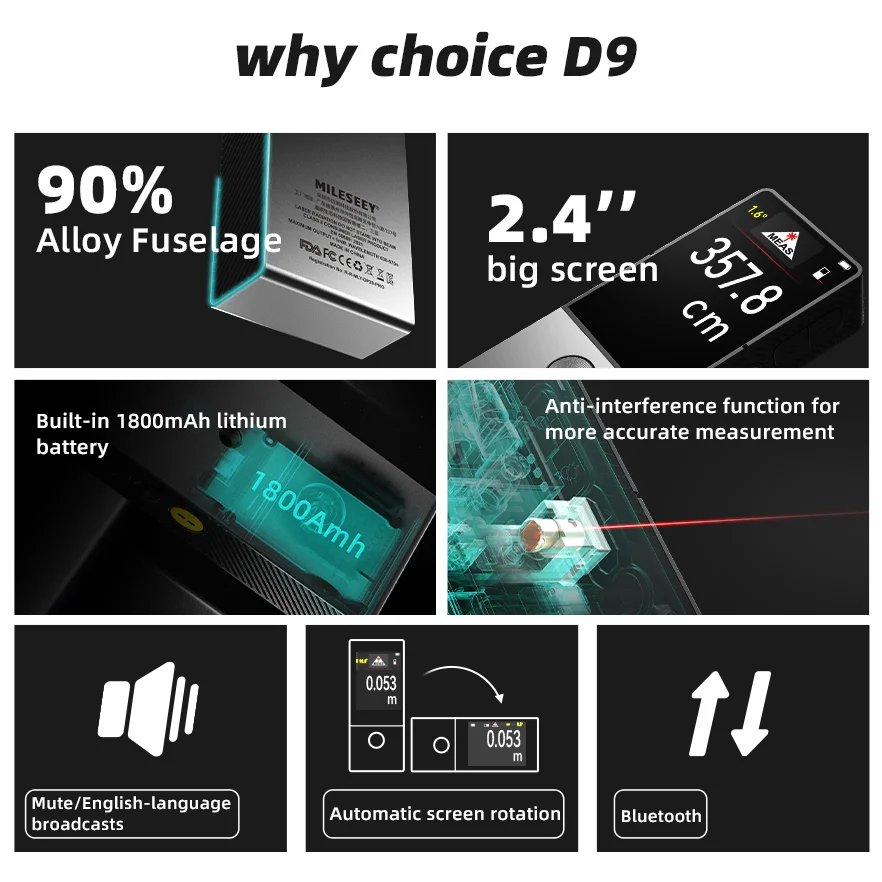 Get precise measurements with MiLESEEY D9 Laser Distance Meter featuring Bluetooth, 100M range and visual alignment. Easily export data to CAD for professional construction and interior projects