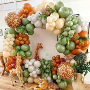 Bring the jungle to life with this playful safari theme party decoration kit. This green balloon arch kit includes deer pattern balloons, metallic gold latex balloons, and everything you need for a stunning balloon arch decoration kit. Perfect for kids birthday party balloons, jungle safari balloon garland displays, or baby shower balloon garlands, this set creates a photo-ready backdrop. Add it to your jungle party supplies for an unforgettable wild one birthday balloons celebration.
